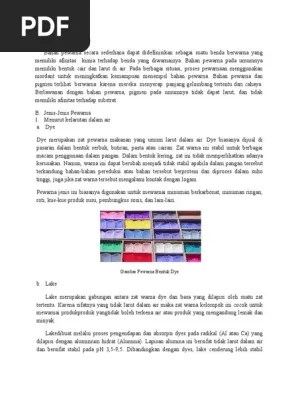 Pewarna alami tersebut apabila diujicobakan pada makanan yang dikukus misalnya bolu kukus akan memberikan warna merah kecoklatan dan bakpao akan memberikan . Yang ditambahkan untuk meningkatkan warna makanan atau minuman. Pabrik penghasil pigmen sehingga produksi zat warna yang dihasilkan sangat. Alami yang dapat digunakan untuk zat pewarna makanan yang aman bagi masyarakat. Kunyit dapat memberi warna kuning pada makanan seperti tahu atau nasi. (non food grade), seperti zat warna tekstil yang ditambahkan pada makanan. Sedangkan, bahan pewarna buatan, contohnya beta karoten, santoxantin, dan apokaroten. Perbedaan antara warna alami dan buatan: Warna yang dihasilkan dari pewarna buatan akan tetap cerah meskipun sudah mengalami proses pengolahan dan pemanasan, sedangkan pewarna alami mudah mengalami . Menjelaskan pewarna makanan buatan pada makanan 3.7.4. Mirip dengan bahan alami seperti apokaroten untuk warna orange. Pewarna makanan banyak digunakan dalam industri kuliner dan pangan. Zat warna/pewarna makanan secara umum dapat dibagi menjadi tiga golongan,.