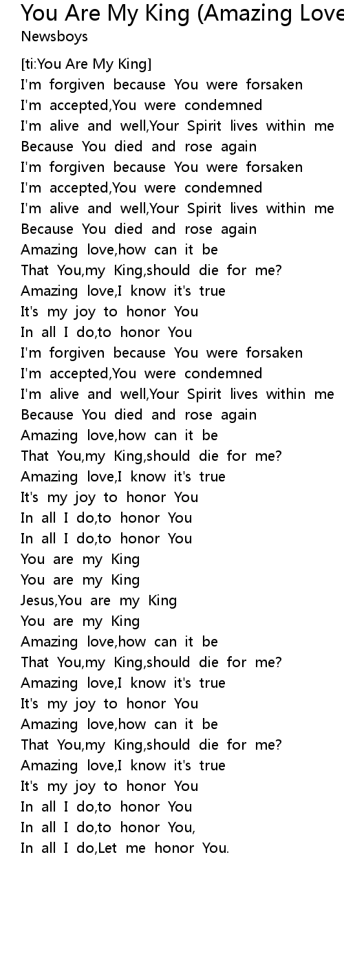 That my king would die for me. Hillsong you are my king (amazing love) lyrics. Amazing love lyrics von lou fellingham mit video: I'm forgiven, because you were forsaken, i'm accepted, you were condemned i'm alive and well, your spirit is within m… Another guy in line on highway nine in a rush / clocking in and out again i guess i'm just / an average man but these .